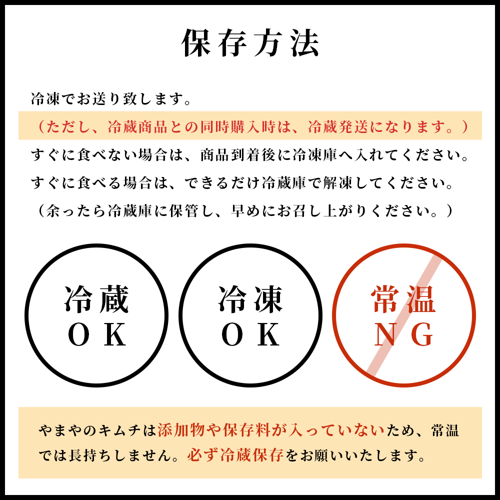 - Note: Because Yamaya's kimchi contains no additives or preservatives, it will not last long at room temperature. Please be sure to keep it refrigerated.