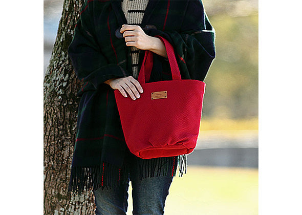 底が楕円になっているふっくらかわいい形のバケツ型のハンドバックで、シンプルなデザインに、刺子織りの質感が優しく活きています。